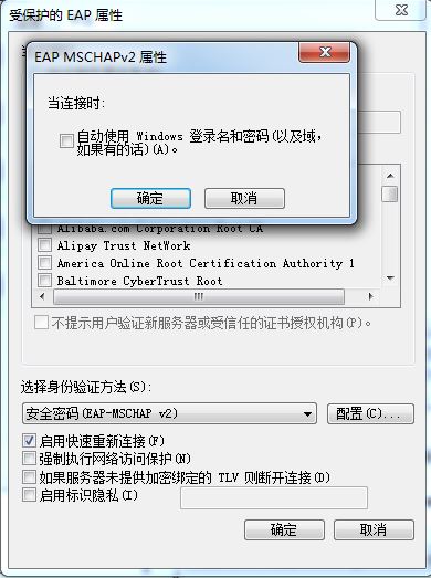 7.点击“设置”进入“受保护的EAP属性”设置,不勾选“验证服务器证书”;点击“配置”进入“EAP MSCHAPv2属性”设置,不勾选“自动使用Windows登录名和密码”;