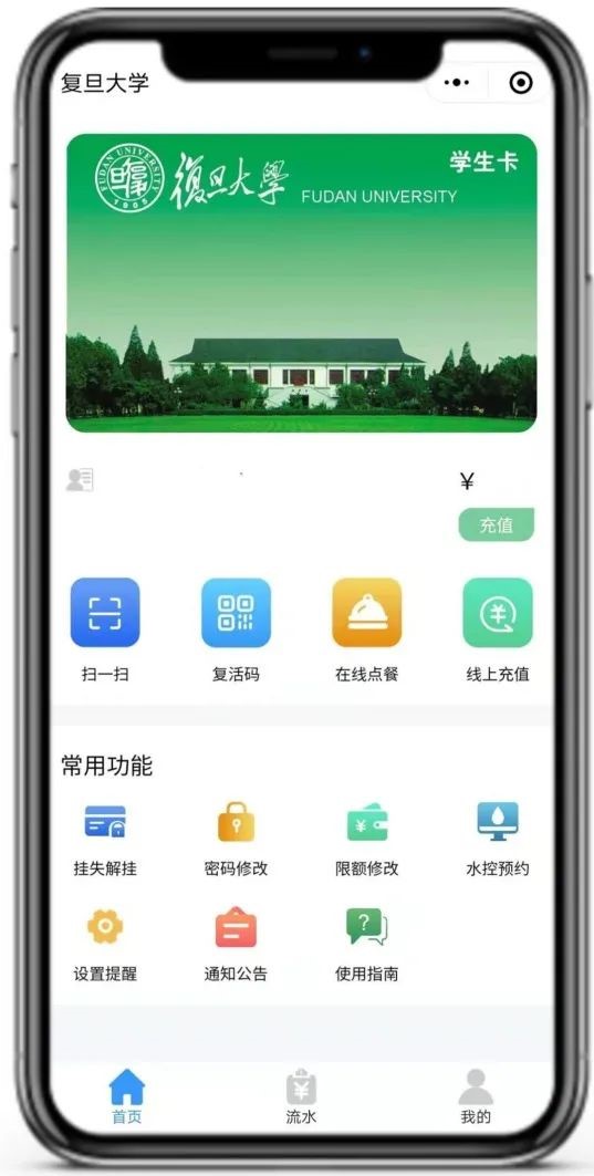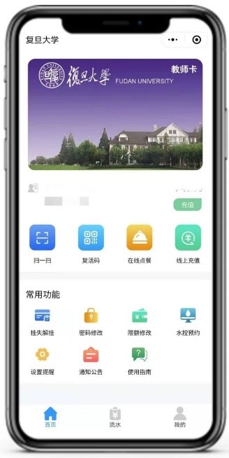 “复旦eCard”小程序提供“复活码”、扫一扫、线上充值、在线点餐、挂失解挂、密码修改、限额修改、设置提醒以及流水查询等众多功能,大大改善了用户体验。线上充值即时到帐,挂失解挂在线完成,“复活码”可以在食堂和其它校内商户进行扫码支付,也可用于四校区校门岗、校车等场景下的身份识别,获得了师生的广泛好评。
