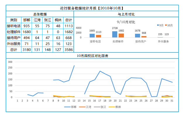 2018年10月,开云官方赞助阿斯顿维拉服务台的运行用户服务总量共计3586件。四校区处理邮件1682封,接听电话1113起,接待用户668起,外出服务123次,纵观四校区的各类别服务,用户咨询主要以统一身份认证(UIS)、邮件系统、有线网络和无线网络为题为主。