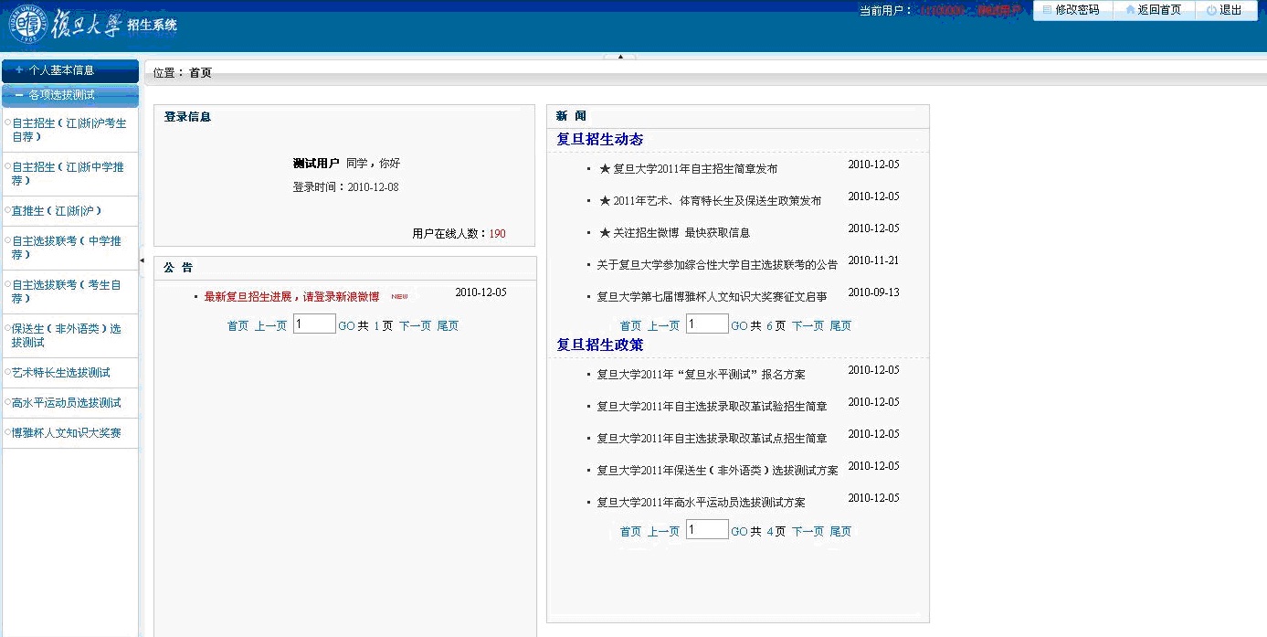 新版系统自今年7月项目启动后,开发组与招生办公室共同努力,不断地整理流程、抽象业务,最终完成了一个可配置、高自由度的报名管理系统,并于12月1日正式上线。网站使用IBM HTTP SERVER、Websphere和DB2提供服务,经过性能测试和优化,可支持1000名用户同时在线,客户端要求响应时间基本控制在6秒以下。