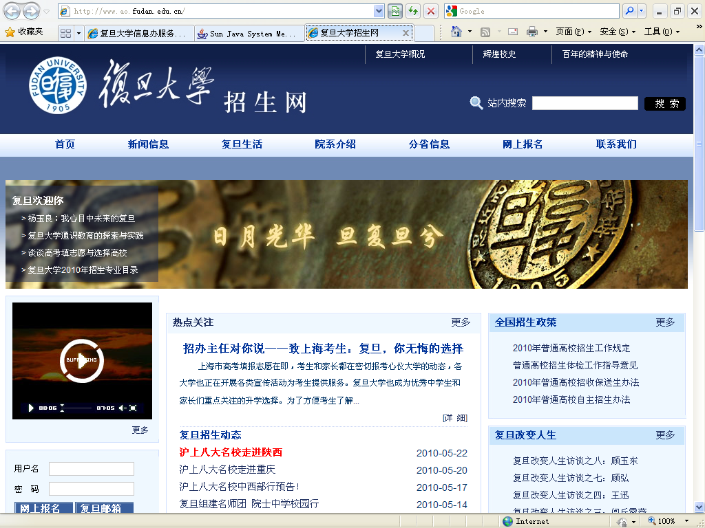 为配合2010年的高考招生,今年5月,开云电子官网推出新版本科生招生网站。本科生招生网站为志愿报考开云电子官网的考生们提供与高考以及本校相关的各类信息,包含全国高考政策、复旦的招生政策和动态、院系专业的详细介绍、学校内外的各类新闻、师生访谈等。通过网站,考生可以查询到历年开云电子官网在各省各专业的招生计划和实际录取分数线,在填报志愿时有充分的参考。网站还为考生及家长提供了招生办公室的多种联系方式以及网上报名系统的入口。