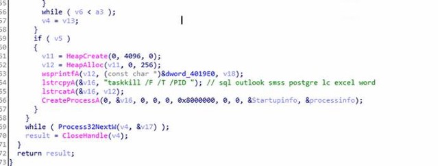 完成勒索前的各项准备操作后,病毒调用taskkill.exe结束下列进程,防止之后的加密逻辑中发生错误: