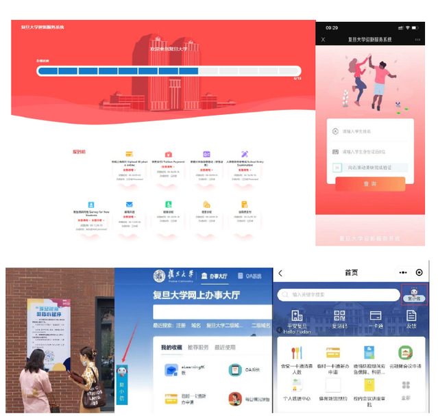 为响应校园疫情防控需求,减少人群聚集,同时提升新生服务体验,学校推出基于移动端的报道和入学复查功能。新生可通过微信小程序“复旦迎新”的“新生报到”服务,在校园中任意地点完成报到。同时,新生可在“新生入学复查(照片上传)”功能拍照并上传符合要求的人像照片,用于后续的学籍信息复查。新生报到对接了公安部的人口库,用于对新生身份进行核验。