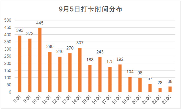 9月4日研究生新生报到当日,使用小程序“刷脸”报到7277人,打卡时间分布如下表。