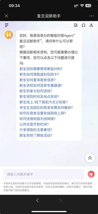 为帮助来自世界各地的新同学尽快融入开云电子官网,信息办基于大语言模型,推出“复旦迎新助手”智能Agent,作为新生的贴心小帮手,为新同学在迎新阶段提供智能问答服务支持,方便新同学快速获取信息。