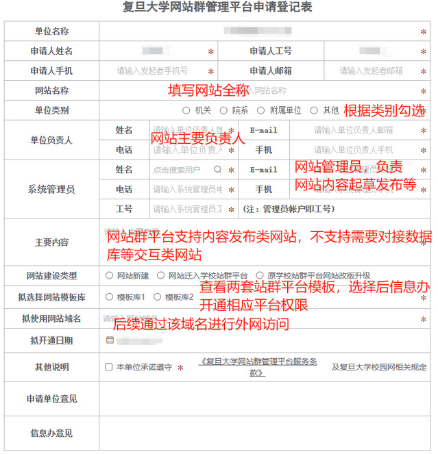 (4)网上办理流程:填写表单à申请单位负责人审批à信息办开通网站建设权限à结束。