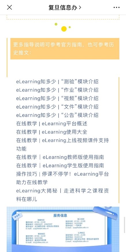 为应对突如其来的疫情给学校在线教学带来的挑战,信息办于3月中旬开始,针对eLearning在线教学平台特别推出了《eLearning知多少》特别系列文档。该系列文档分别面向教师和学生角色,对平台模块“公告”、“文件”、“视频”、“作业”、“测验”、“讨论”分期进行了详细的功能介绍。尤其是在5月临近期末考试期,借助“复旦信息办”微信公众号,推出了教师们该阶段最可能用到的“作业”和“测验”模块,尽可量做到与教学节奏同步,方便更多的师生查阅参考,为特殊时期的校外在线教学考试需求提供了有力保障。后续,信息办将继续推进《eLearning知多少》系列宣传,多维度助力师生的在线教学工作。
