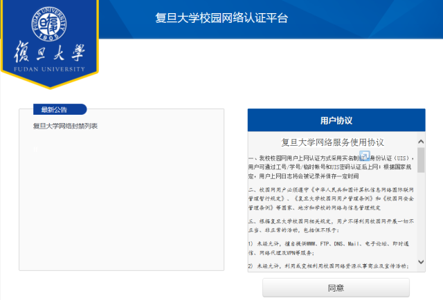 (2) First-time users are required to accept the Fudan University Network Service Usage Agreement, as shown in the figure below.