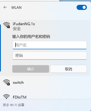 1) 点击右下角网络图标打开网络选择列表,等待搜索到iFudanNG.1x信号,选择并点击“连接”,然后输入无线网络帐号信息,点击“确定”;