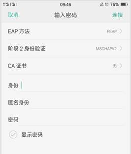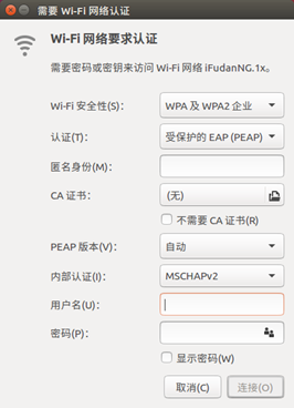 2、点击iFudanNG.1x,会弹出配置窗口,安全类型选择“WPA2企业”,认证方式选择“PEAP”,PEAP版本为“自动”,内部二阶段认证选择“MSCHAPv2”,在用户名和密码处输入无线网络账号信息,点击“连接”即保存设置并自动连接。返回终端列表。