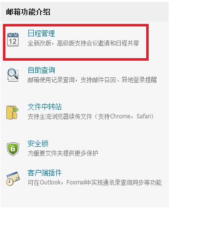 日程管理,提供新建日程、日程提醒和归类管理的多项功能,有效地管理自己每天的日程安排和时间安排,快速提升工作效率,不错过每个重要的会议或约会。邮箱入口:登录邮箱,在右侧菜单上找到日程管理点击进入,如图: