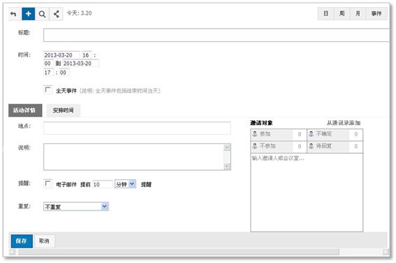对事件进行基本信息填写。事件基本信息中的活动详情有地点填写选择,右手边就出现邀请对象和会议室两种选择,根据个人需求,进行对象添加,如下图所示: