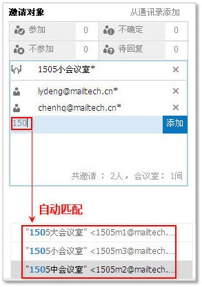 添加会议室,可在空白处输入会议室名便可以自动匹配相关会议室,点击添加;