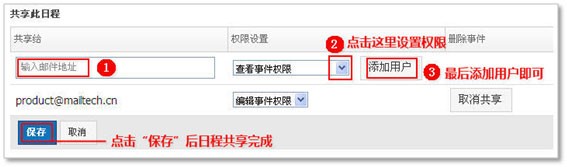 先在相应框内输入被共享人的邮件地址,然后设置共享的权限,添加用户后点击保存,即可成功设置日程共享,步骤如图所示: